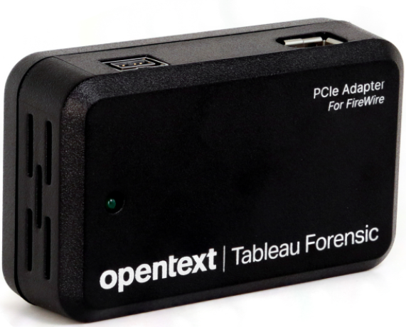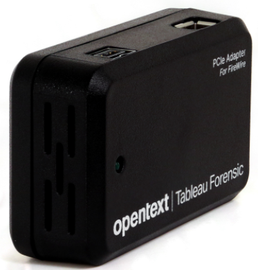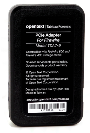 The TDA7-9 Adapter connects a FireWire device or a Mac in Target Disk Mode to a compatible Tableau Writeblocker or Duplicator. The adapter is compatible with the Tableau Universal Bridge T356789iu, the T7u and the TX1 Forensic Imager. The TDA7-9 can be used with all current and future PCIe-compatible Tableau products. With the T7u and T356789iu only one FireWire device is recognized at a time. The TX1 is able to use two drives independently.